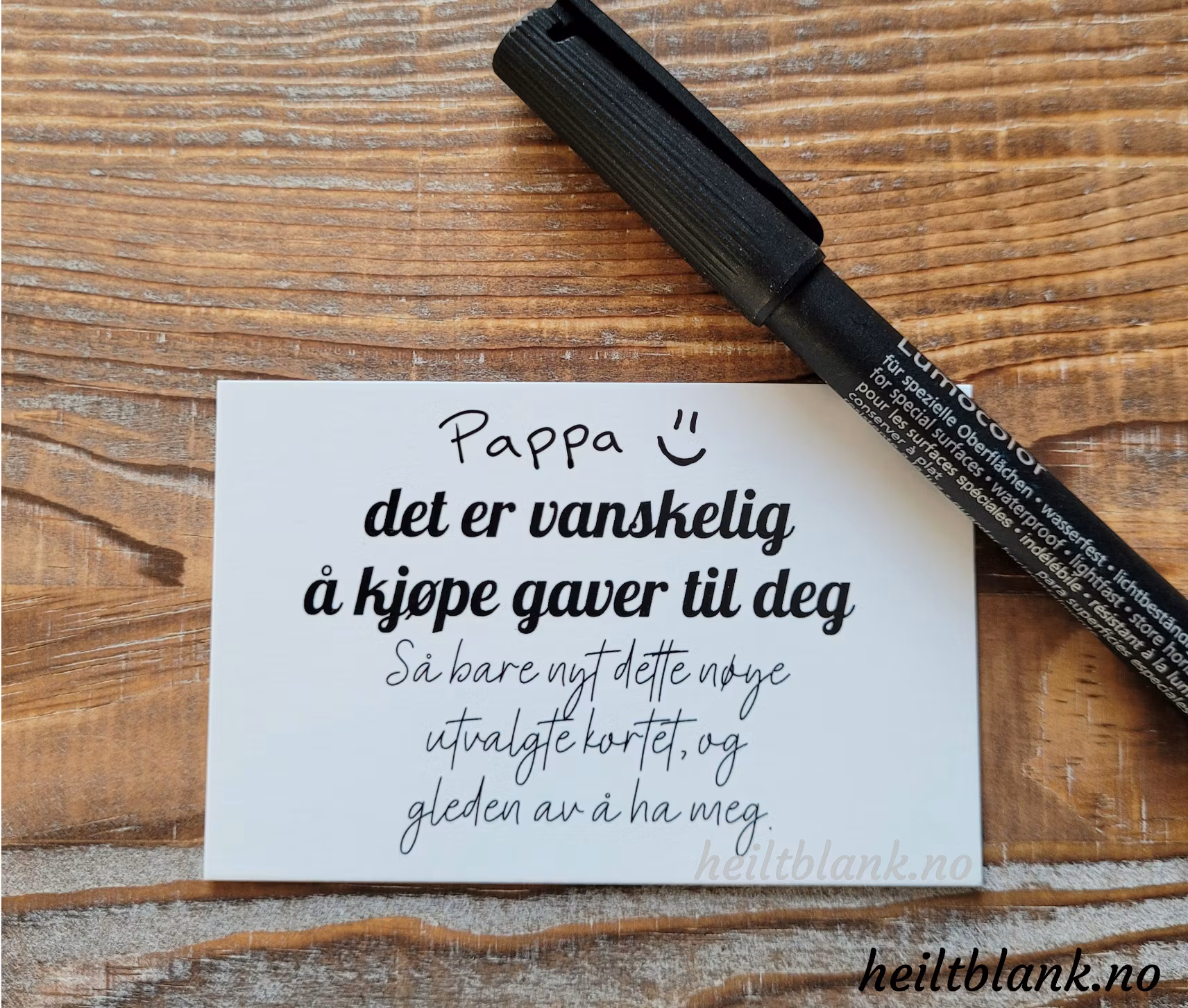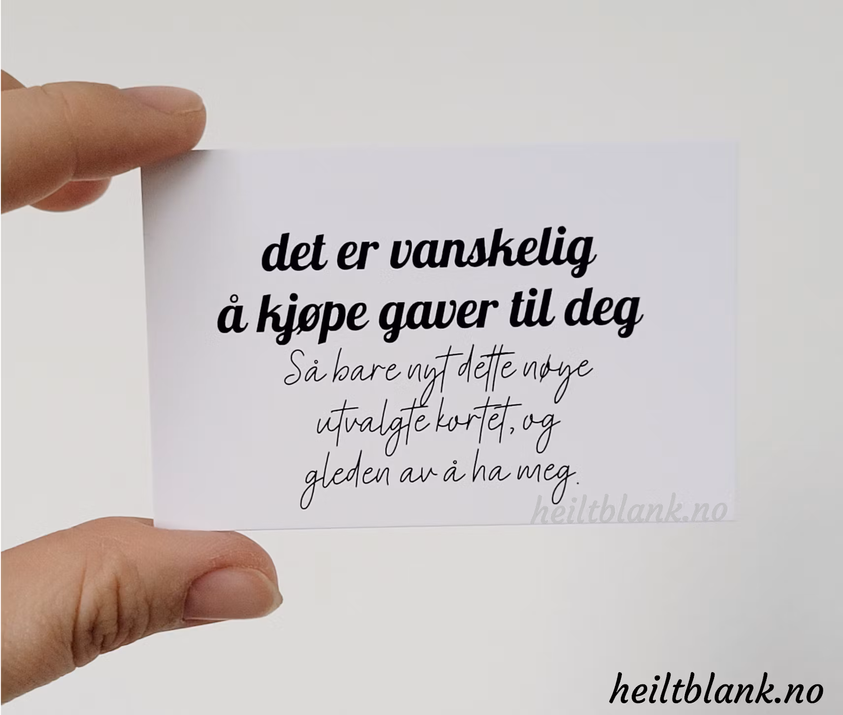 Morsomme kort - 1stk 10,- 7,- Produktet finnes dessverre ikke på lager. Morsomt kort til den som har alt!Du skriver selv navn på mottaker øverst på kortet, det er også mulig å skrive bakpå kortet.1stk i én pakke.Det følger også meden liten konvolutt.Størrelse - 8,5cm x 5,5cm