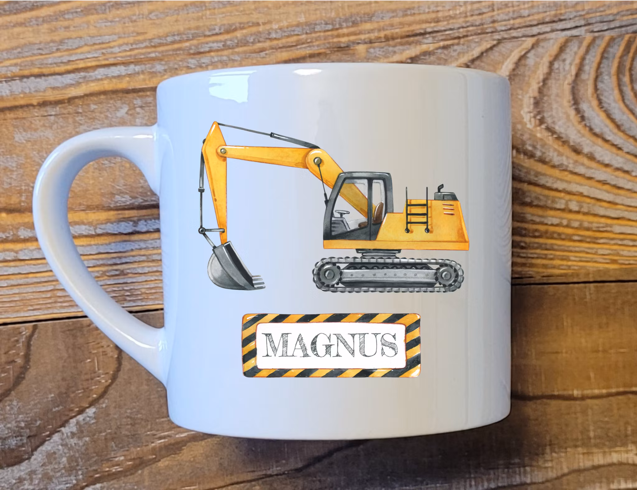 Personlig barnekopp med gul gravemaskin på, motiv på begge sider.