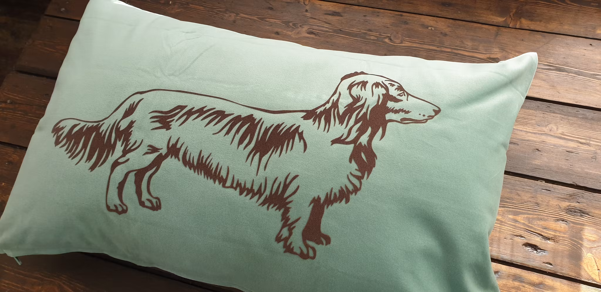 Sune Putetrekk - Lysegrønn med brunt motiv - langhåret dachshund 299,- 209,- Produktet finnes dessverre ikke på lager. Lysegrønn pute med brunt motiv.Motivet er mykt og kjennes ut som fløyel.OBS - her får du kun med putetrekk.Ønsker du også innerpute finner du det i nettbutikken.Mål : 65cm x 40cm